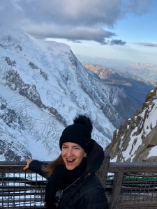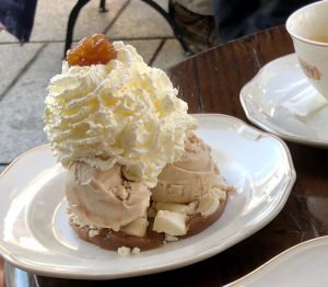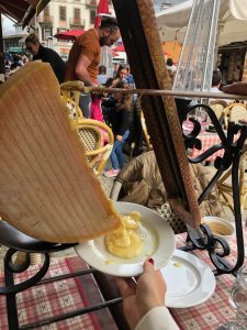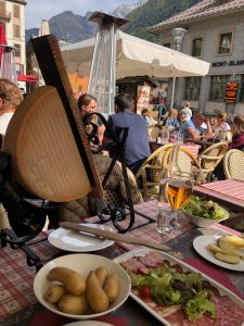 After the walk, we come to the center where also our hotel is located. Since Chamonix is an international mountain sports center, there are small shops of all sports brands you can think of. In addition to these sports shops, there are cafes, restaurants and bars in the center. Since we’re hungry, we’re starting to look for a nice place to have lunch. We decide on a restaurant where we can taste local delicacies. We are very lucky because the weather is sunny and we can sit outside with a lovely mountain view. We order “Raclette” which is the famous flavor of the region. The cheese wheel comes with a heater so we can scrape the melted cheese and eat it with potatoes, delicatessen and pickles. After enough time of enjoying ourselves like cats in the sun, we walk around the center on foot. We try Mont-Blanc ice cream in a cute ice cream shop. There are pieces of meringue and chestnut in the delicious milk ice cream like the dessert with the same name.